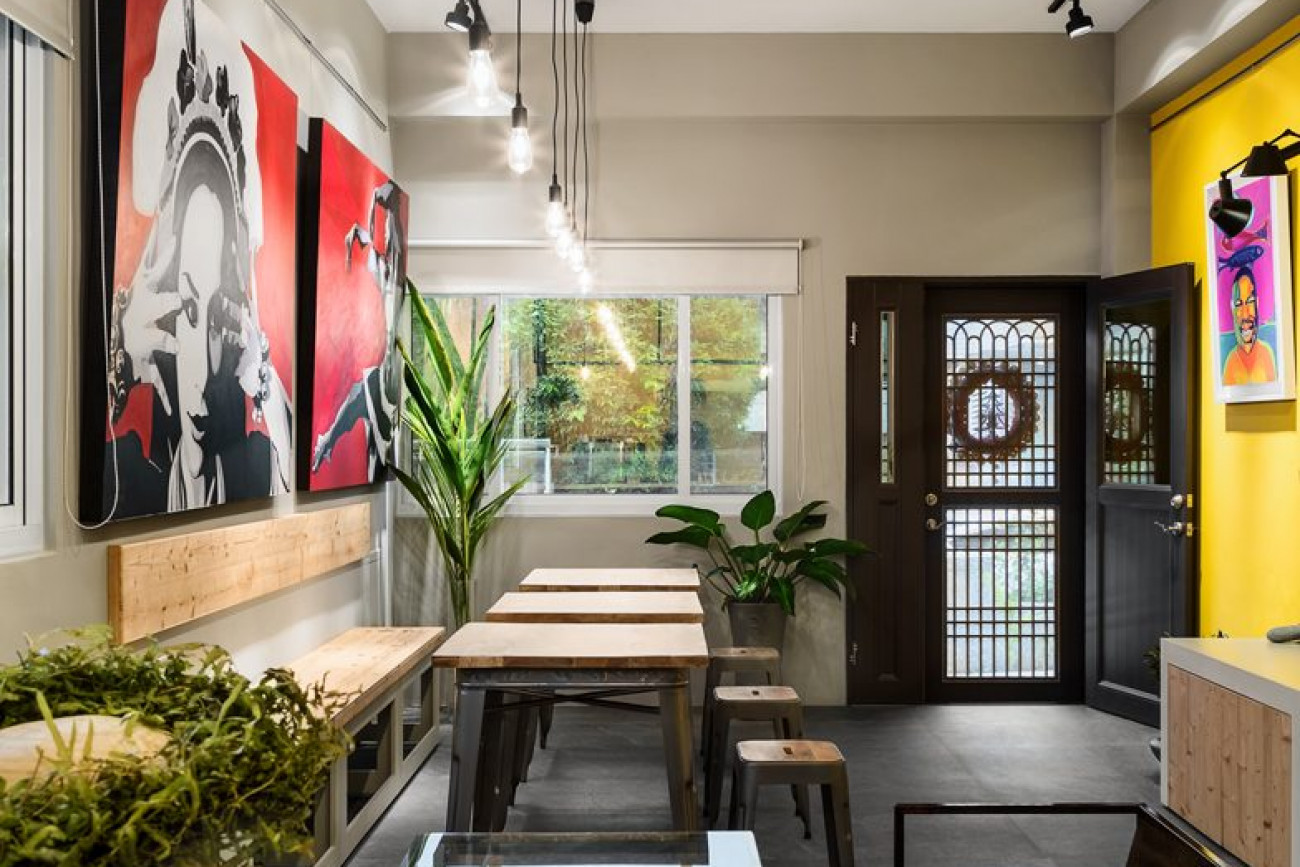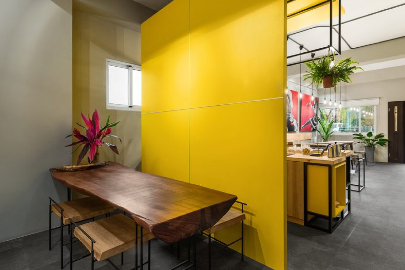 因此天空元素在店面設計風格裡,就有了一個很好的店面裝潢風格走向,大膽的黃色及原木色,半工業風格的基礎空間規畫,就是為了能讓這些藝術住進這個家裡。
