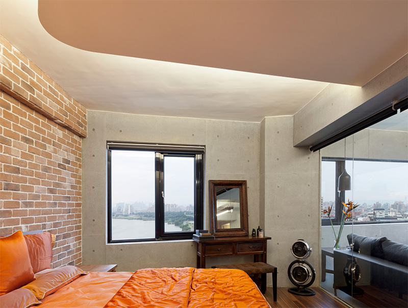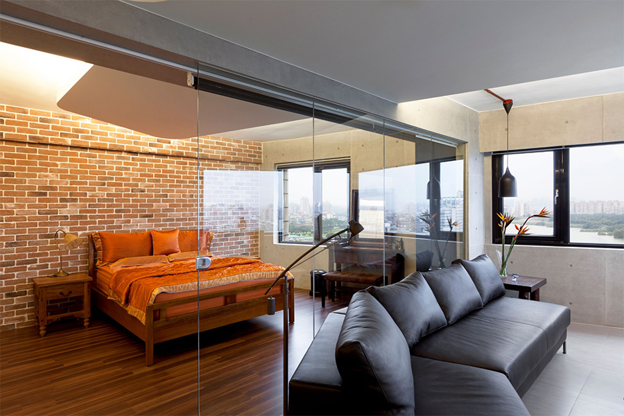 房間大膽採用玻璃隔間,破除室內與室外的藩籬,一起床就可以讓景色映入眼簾,而不是面對一個隔間牆。隱私的重要性則藉由額外設計拉簾得以權衡。