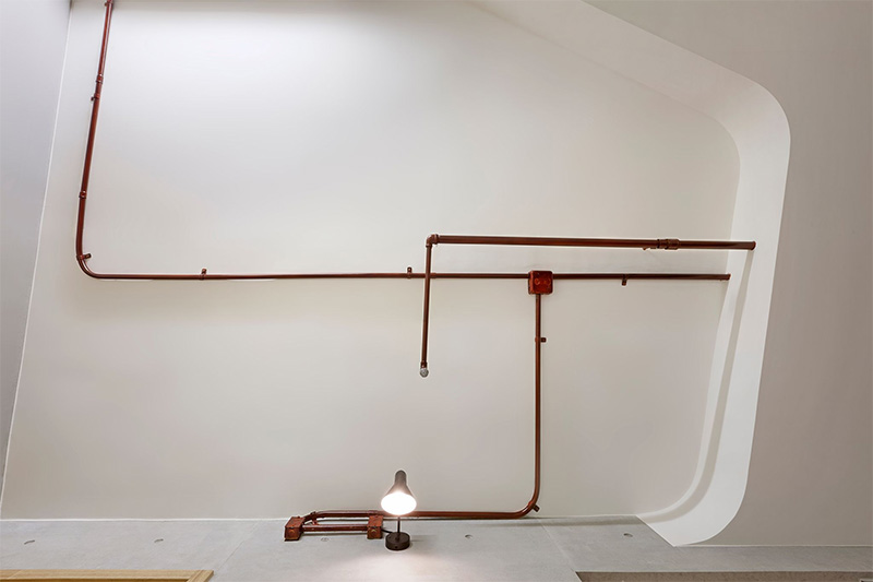 不把天花板全部包覆起來,反刻意的留出其消防管的結構性,並以弧形修飾結構的呆板,讓天花板自己去說故事!