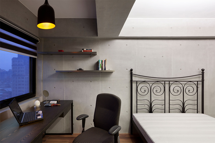 在客房同時也是重要的書房中,徹底運用清水模,讓原生的概念展現在此空間的各角落。 屋裡的櫃體都是仿古家具,為極簡增添”歷史感的故事性”,包括這帶點歐式風格的床架,讓線條不是只有水平與垂直而已。