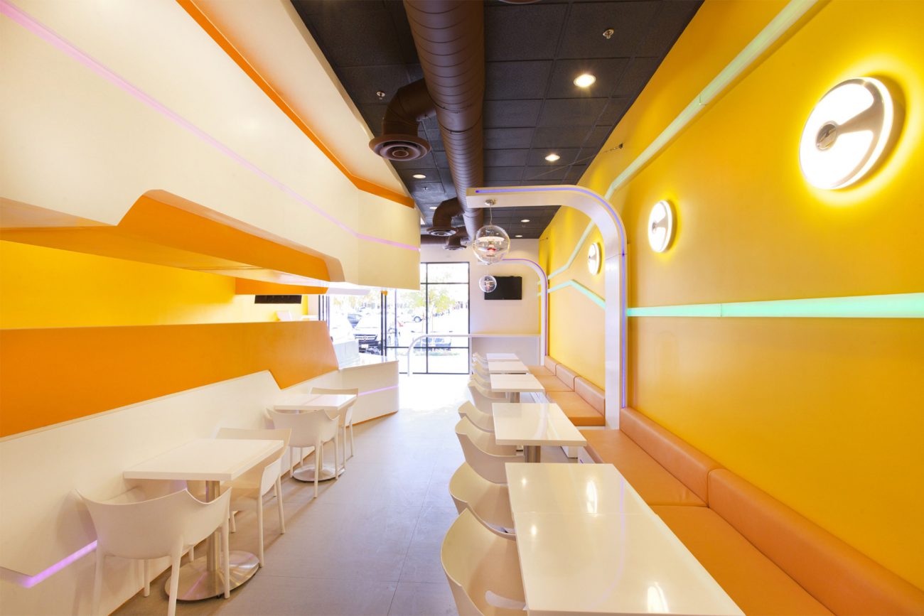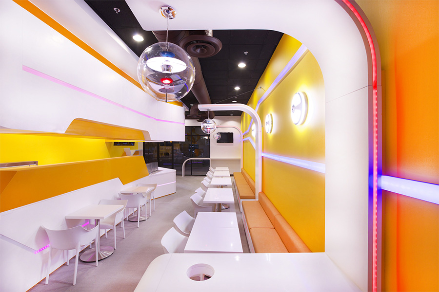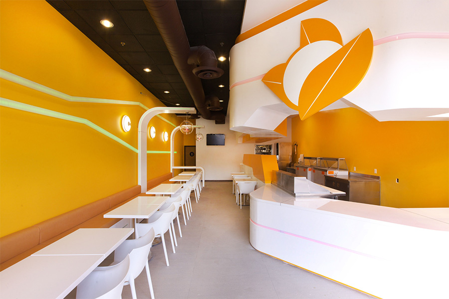 配合”加州陽光”的主題,我們大量的運用黃色及明色系列,白天的LOLLICUP在自然光的照耀下別有一番感受!櫃台牆邊的造型展示架,亦蘊含設計巧思,如同此案中的所有櫃體,皆採用組裝的概念得以成型。